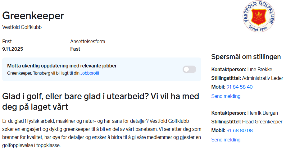 Vi søker etter en engasjert og dyktig greenkeeper til å bli en del av teamet vårt. Personen vi ønsker å finne må like fysisk arbeid, være trygg på håndtering av ulike maskiner og ha sans for detaljer.