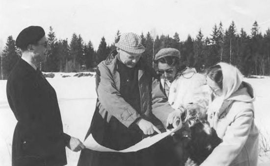 Befaring på baneområdet sent på 50 tallet. fra venstre: Knut Christiansen, Harald Krogh-Hansen, Aasta Wahlstrøm og Else Christensen © Vestfold Golfklubb